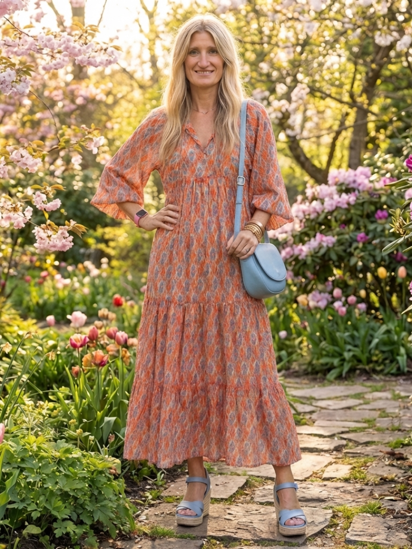 This dress features an allover geometric pattern with a relaxed, flowing shape. The fabric is light and airy, allowing for ease of movement throughout the day. It fits naturally into everyday wear, whether for time out or casual gatherings.
