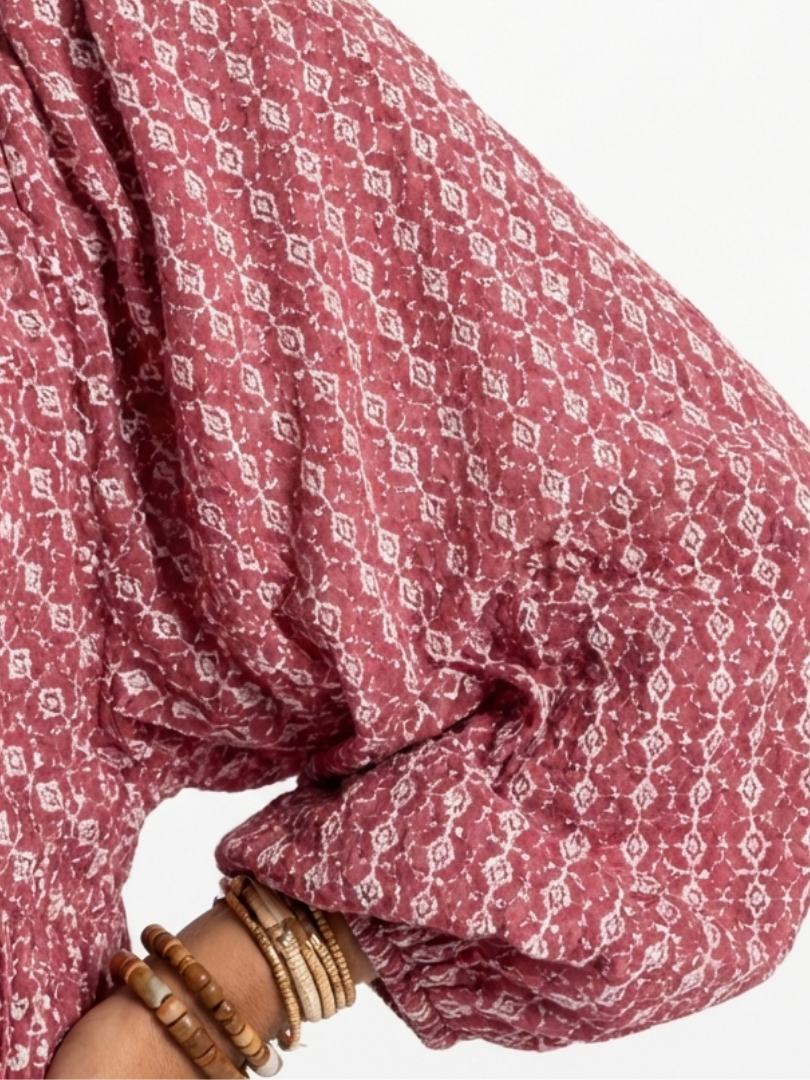 This dress features a small geometric pattern with a relaxed, straight silhouette. The fabric is lightweight and easy to wear, allowing for comfort throughout the day. It works well for everyday routines, from casual outings to quiet gatherings.