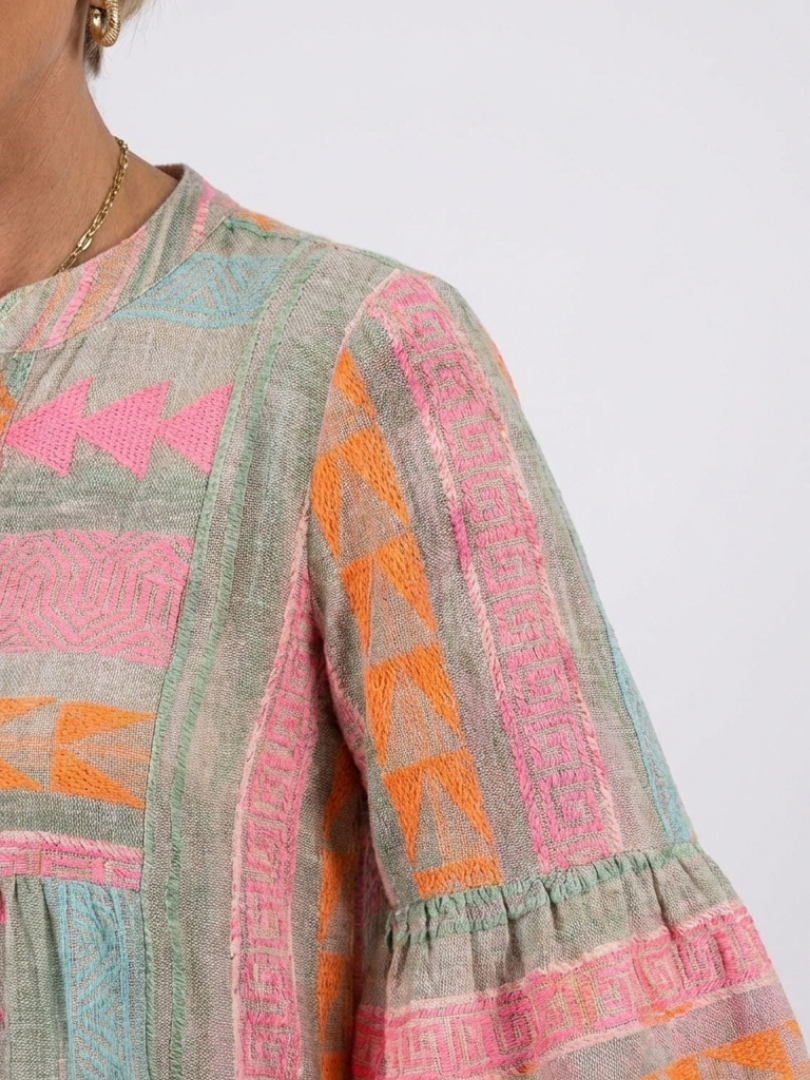 This dress features a mixed geometric pattern with a softly structured, tiered silhouette. The fabric is lightweight and moves easily, offering comfort for all-day wear. It fits well for casual outings, daytime plans, and warm weather use.