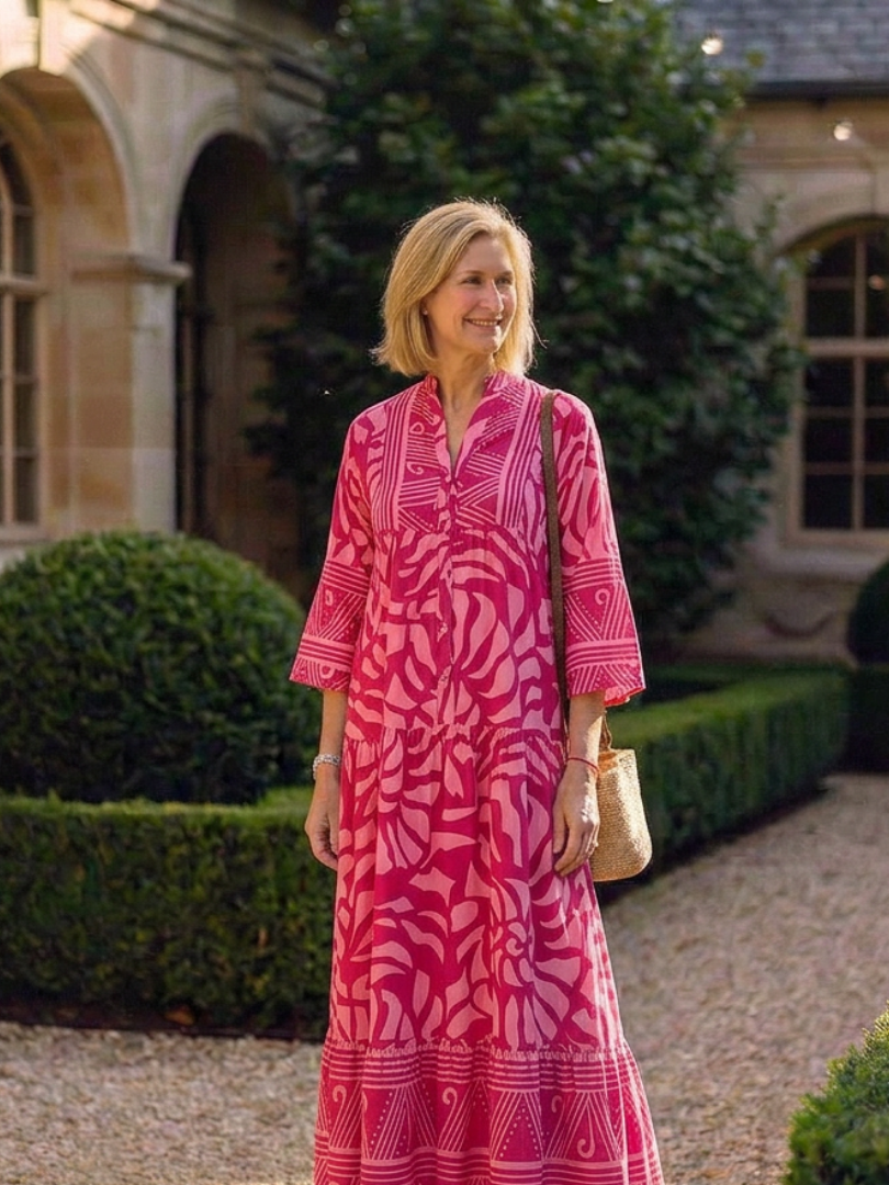 This dress features a relaxed shape with a soft collar neckline and a button front. The lightweight fabric falls gently into a loose midi-length skirt with patterned trim along the neckline and hem. It feels airy and easy to wear, making it suitable for warm days, casual outings, or travel.